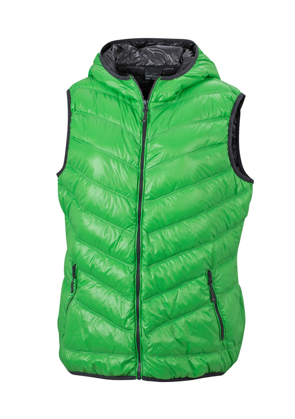 Ultralet dunvest med hætte, kontrastfarver i for og hætte, 2 lommer med lynlås foran, kan pakkes sammen i medfølgende pose, lige kanaler på front og rygstykke.